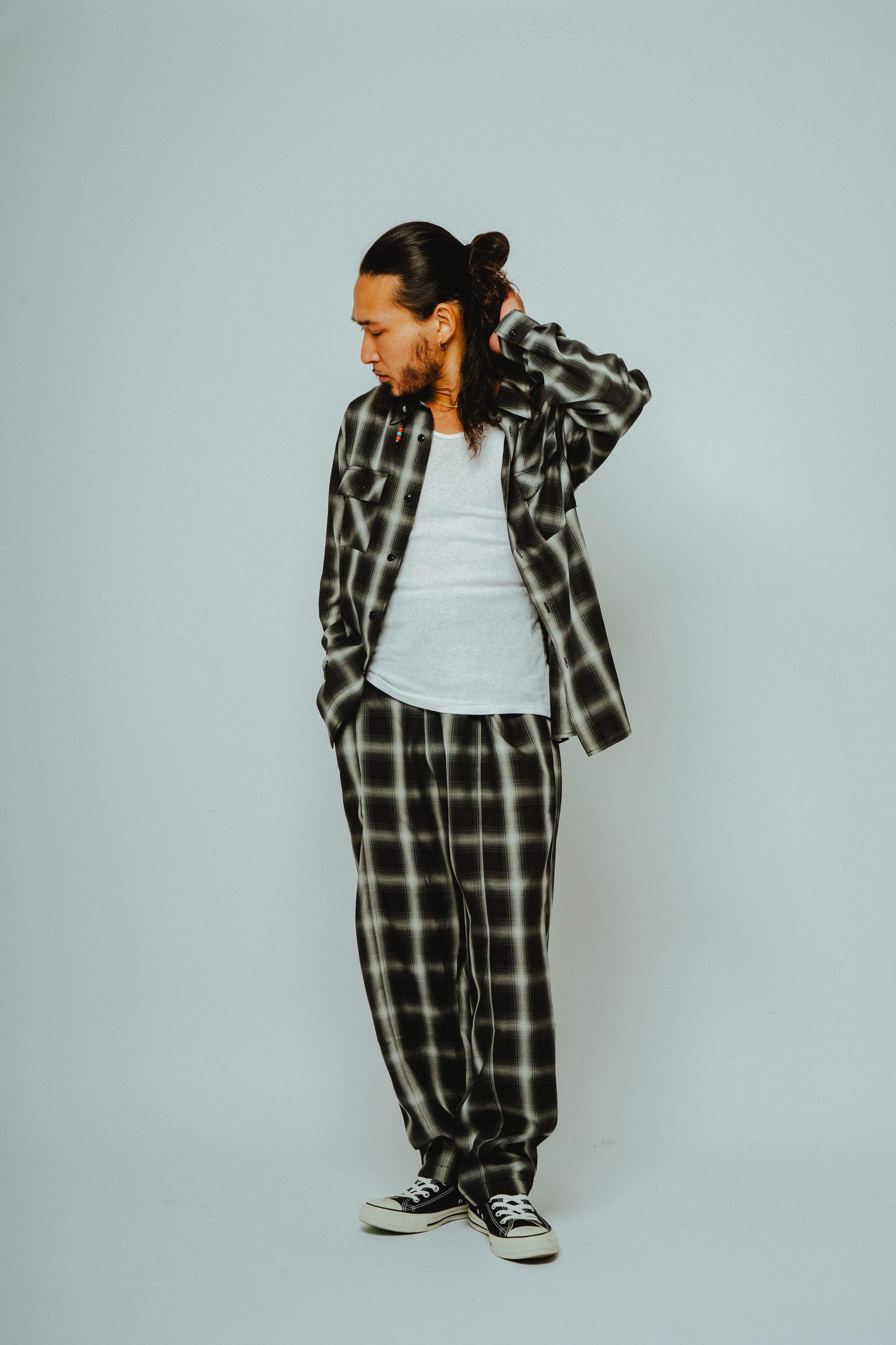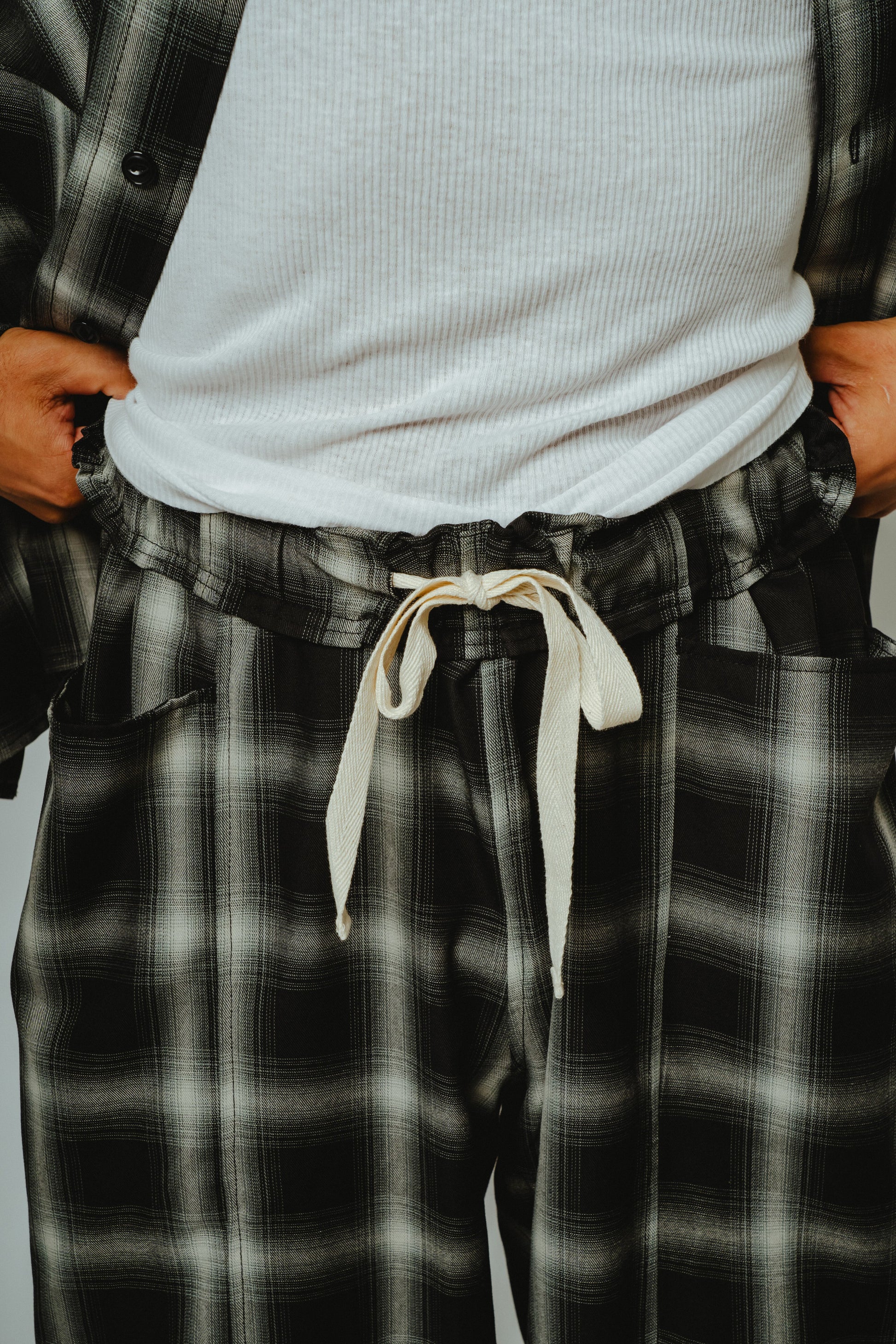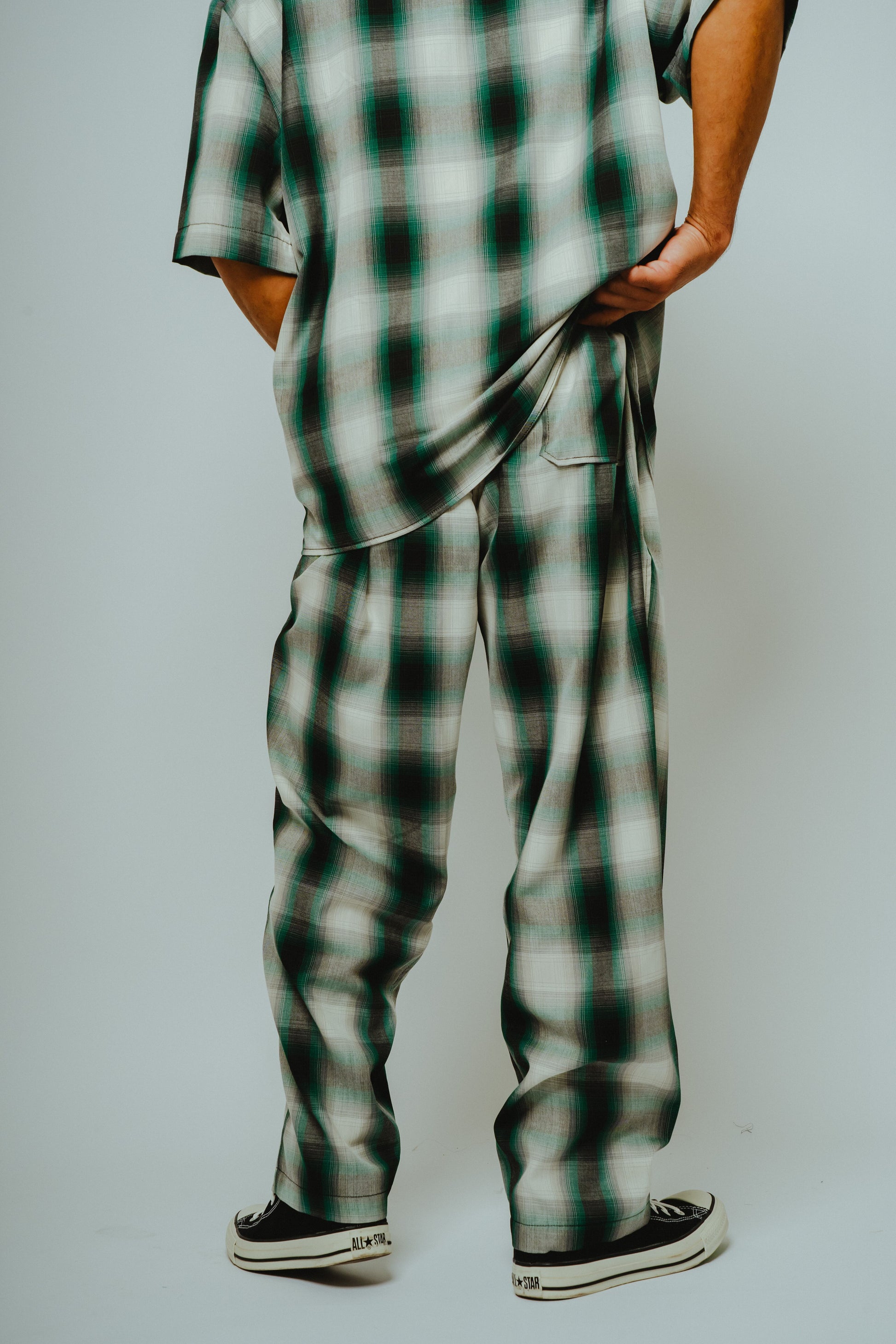 アメカジの王道であり、ワークブランドとの相性の良いオンブレチェックを、極上のリラックスパンツへ落とし込みました。レーヨン混素材ならではのとろみのある質感と美しいドレープが、歩くたびに自然な揺れを生み、コットン素材では表現できない大人の余裕を演出します。