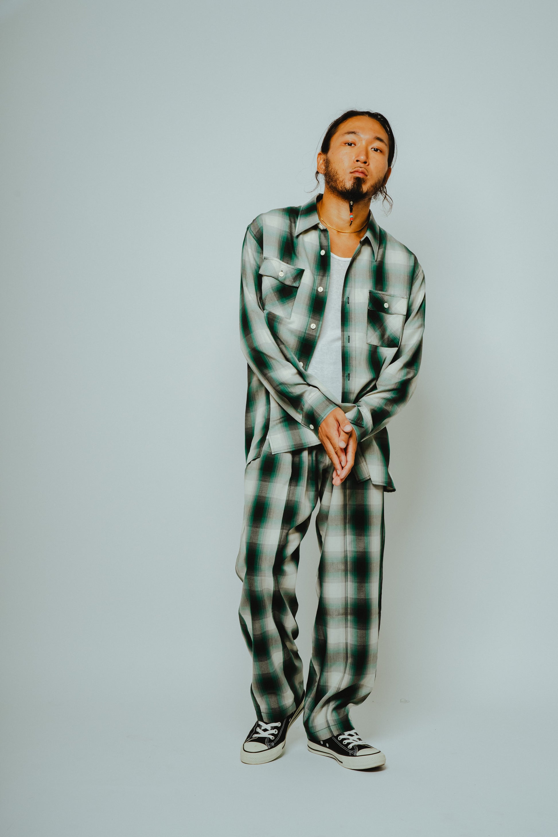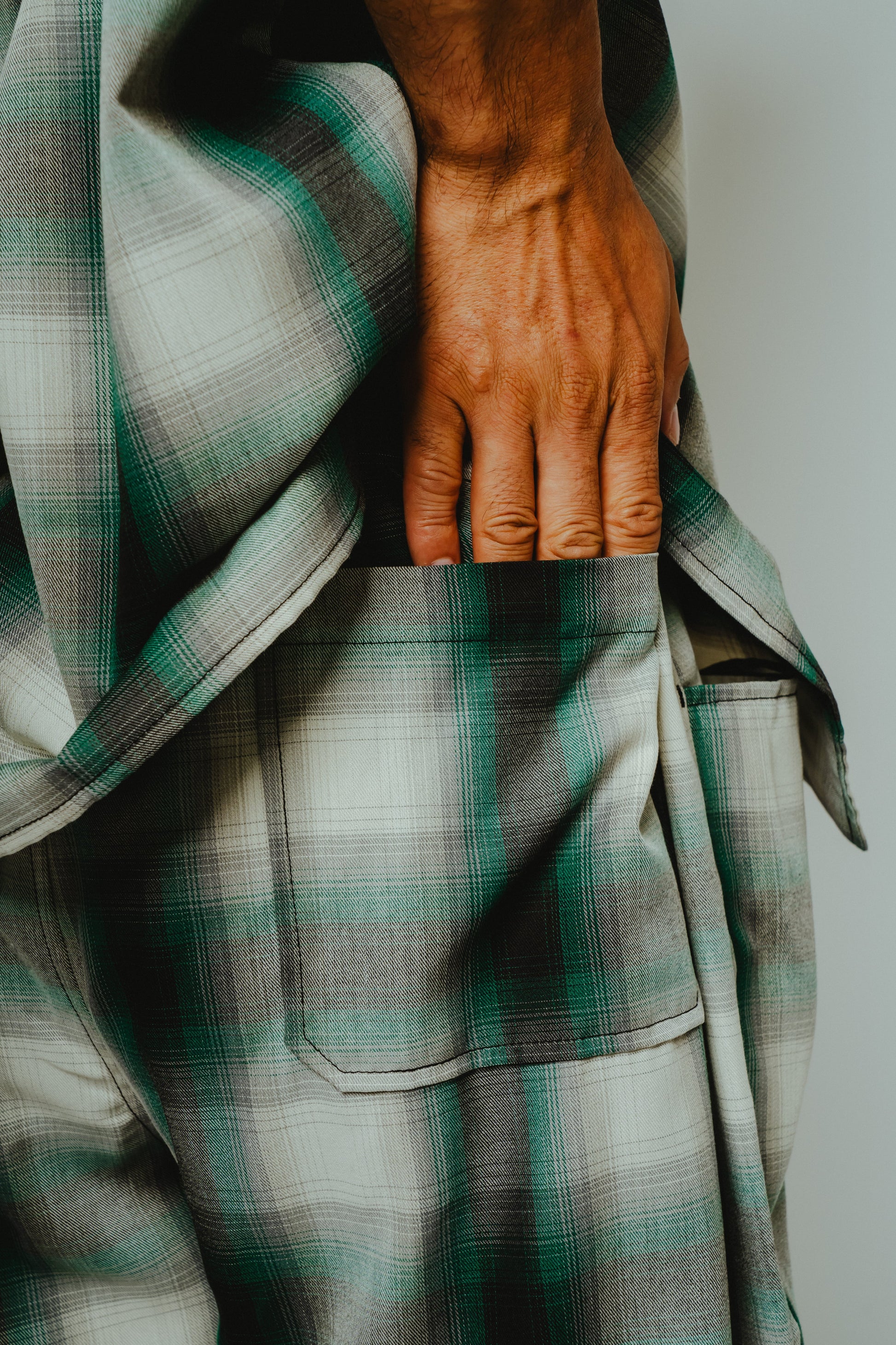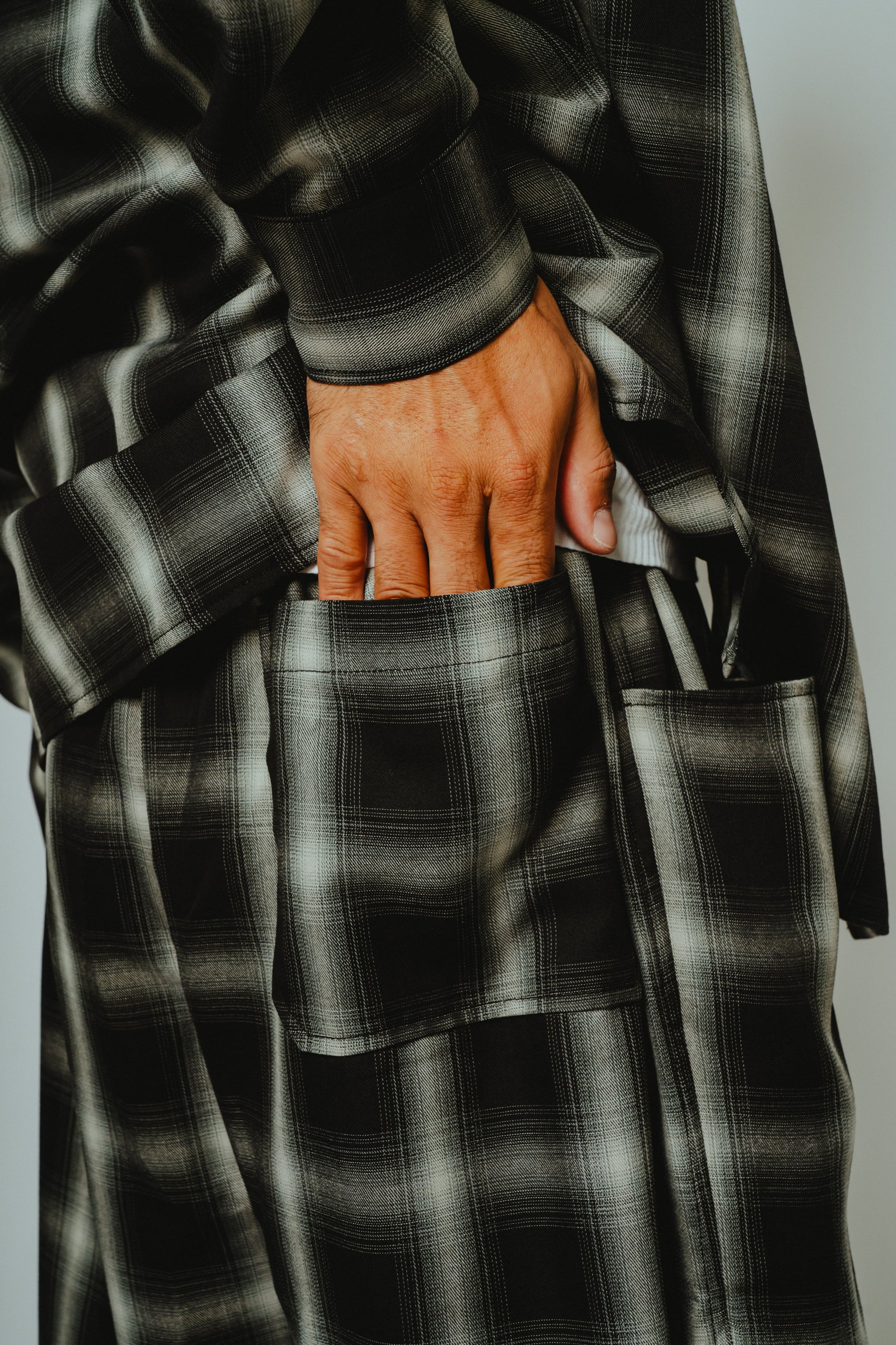 アメカジの王道であり、ワークブランドとの相性の良いオンブレチェックを、極上のリラックスパンツへ落とし込みました。レーヨン混素材ならではのとろみのある質感と美しいドレープが、歩くたびに自然な揺れを生み、コットン素材では表現できない大人の余裕を演出します。