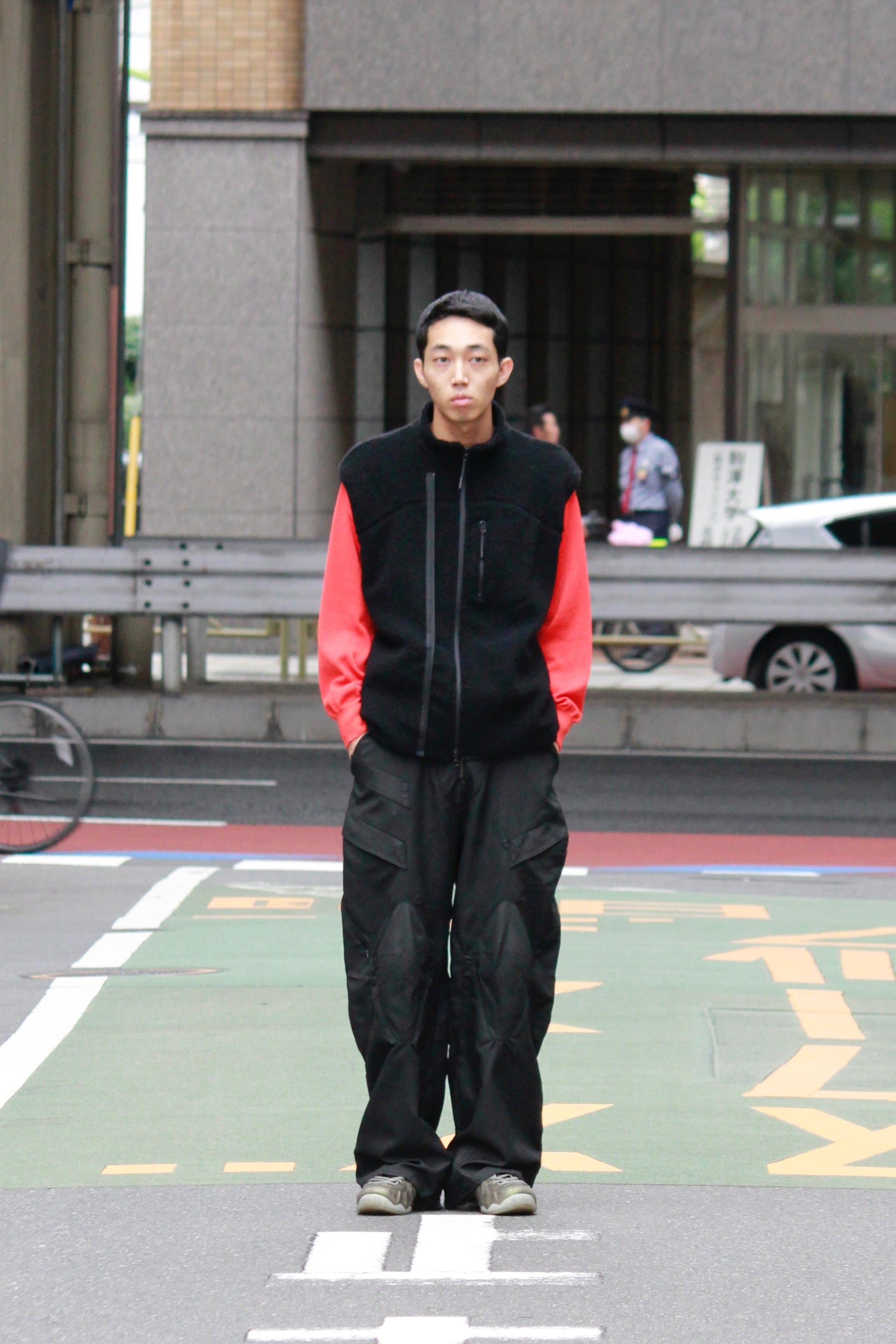 フロントに並列して配置した2本のZIPが特徴的なスタンドネックベスト。
