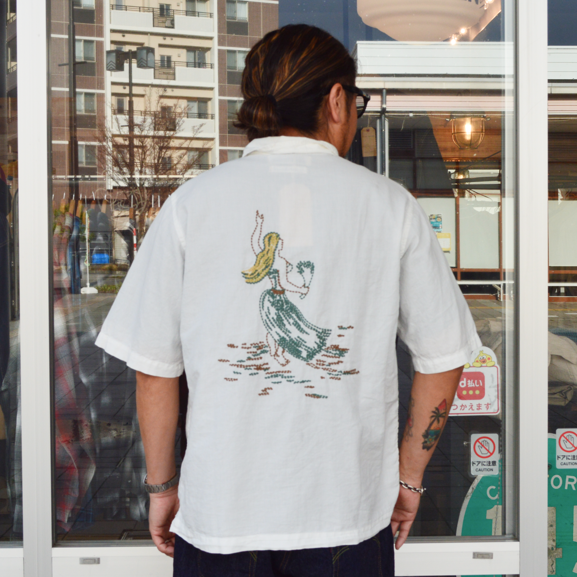 ゆるやかな風をはらむ、軽やかなアロハシャツに、背中いっぱいの“フラガール刺繍”がリズムを刻む。