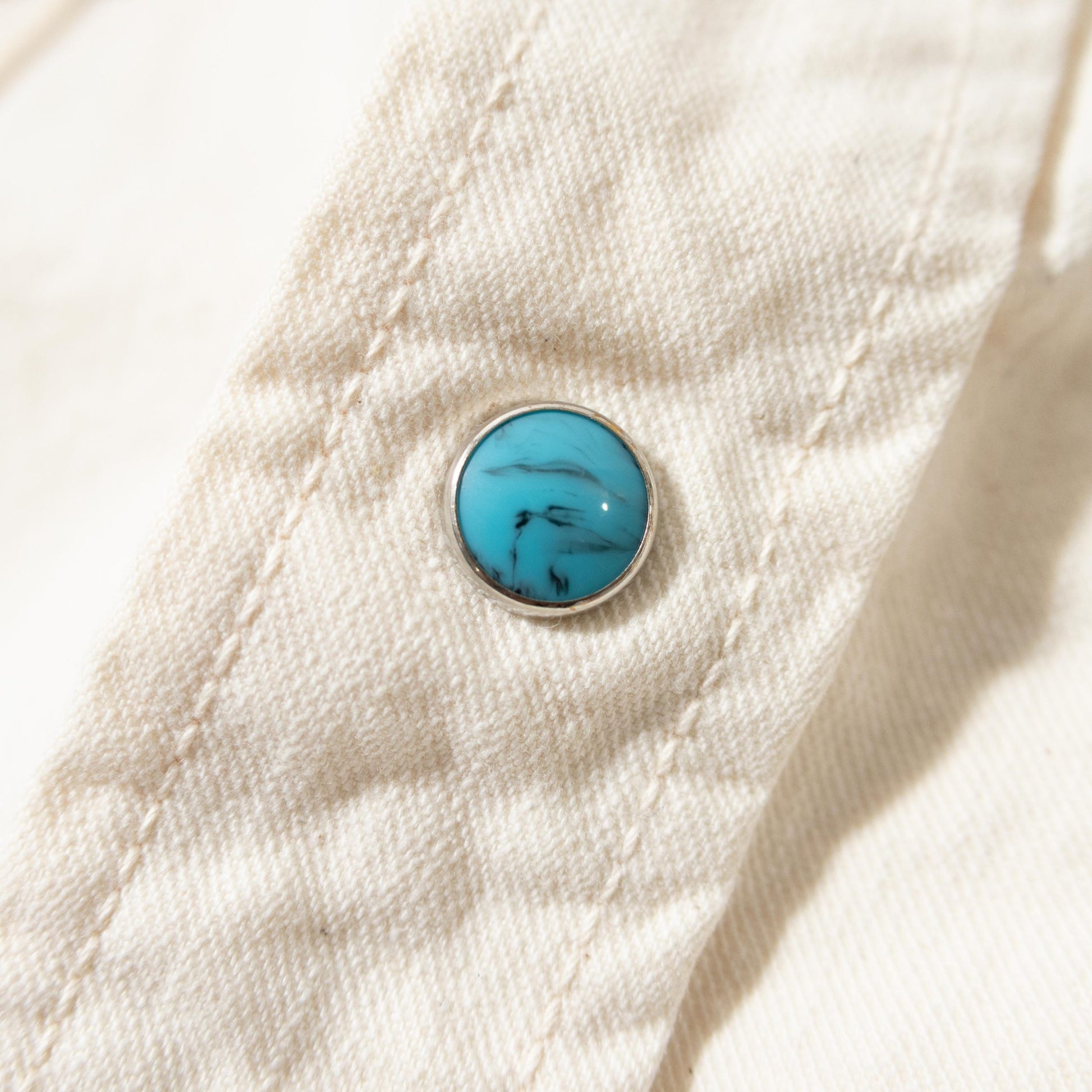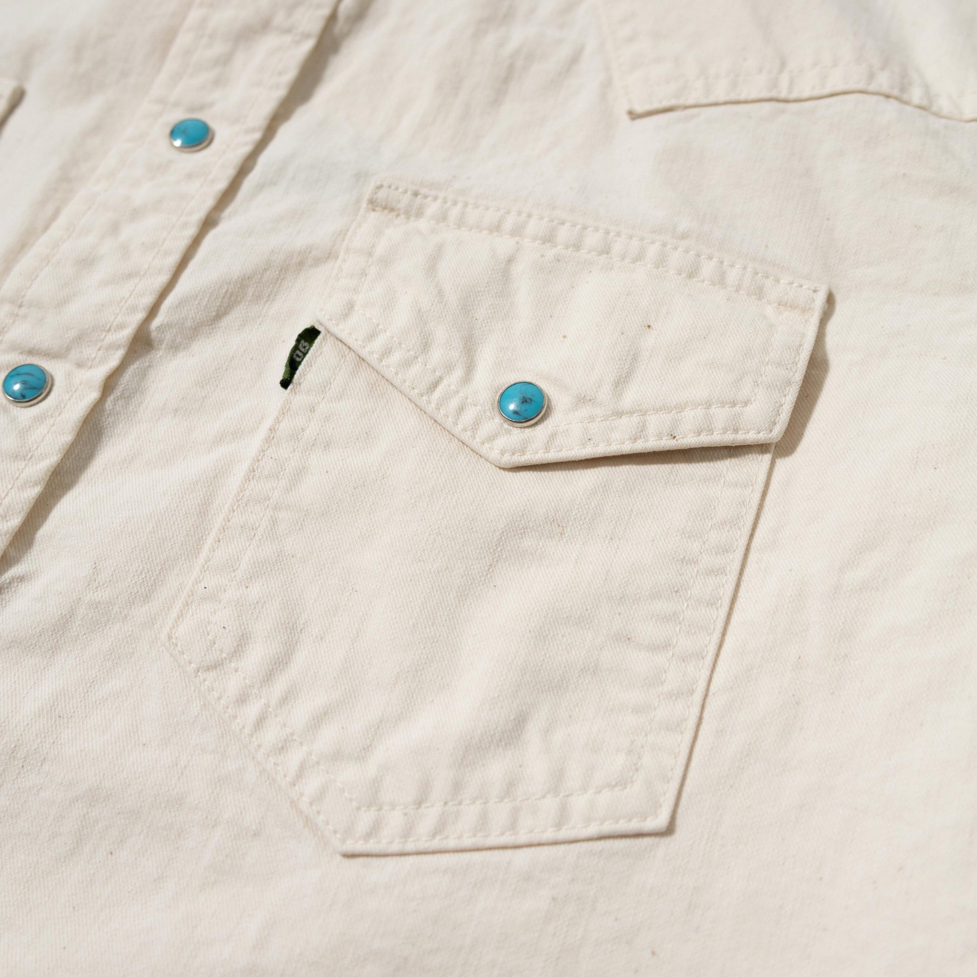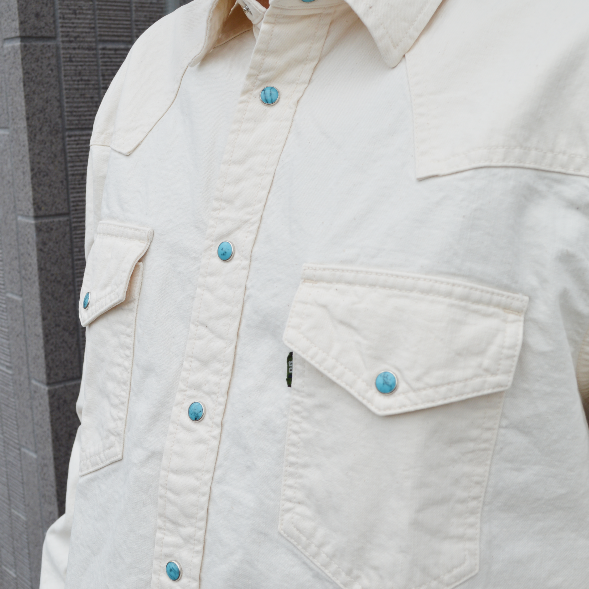 ターコイズボタンがアクセントになり、一枚でも主役になるオススメの非常にクールなシャツです。