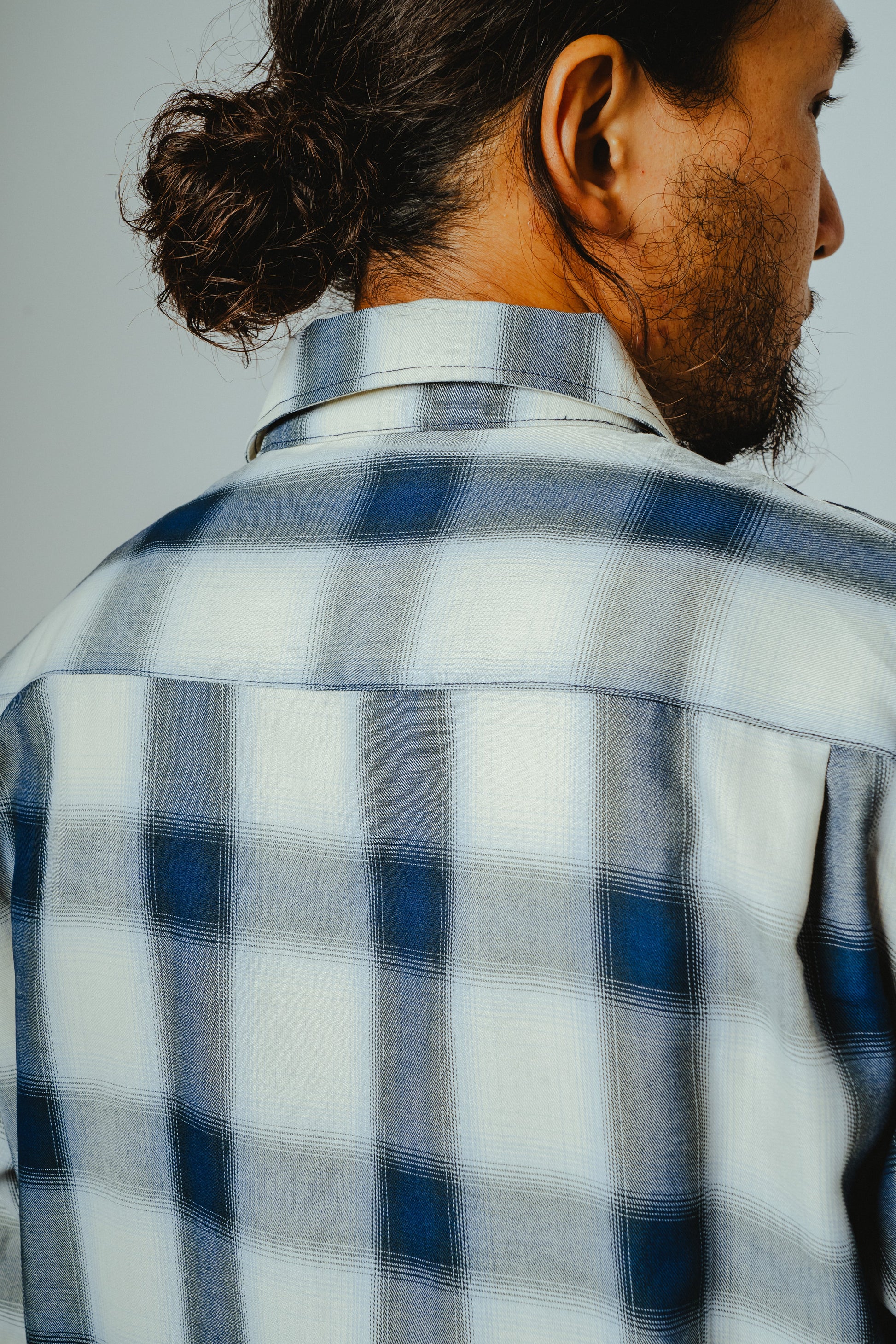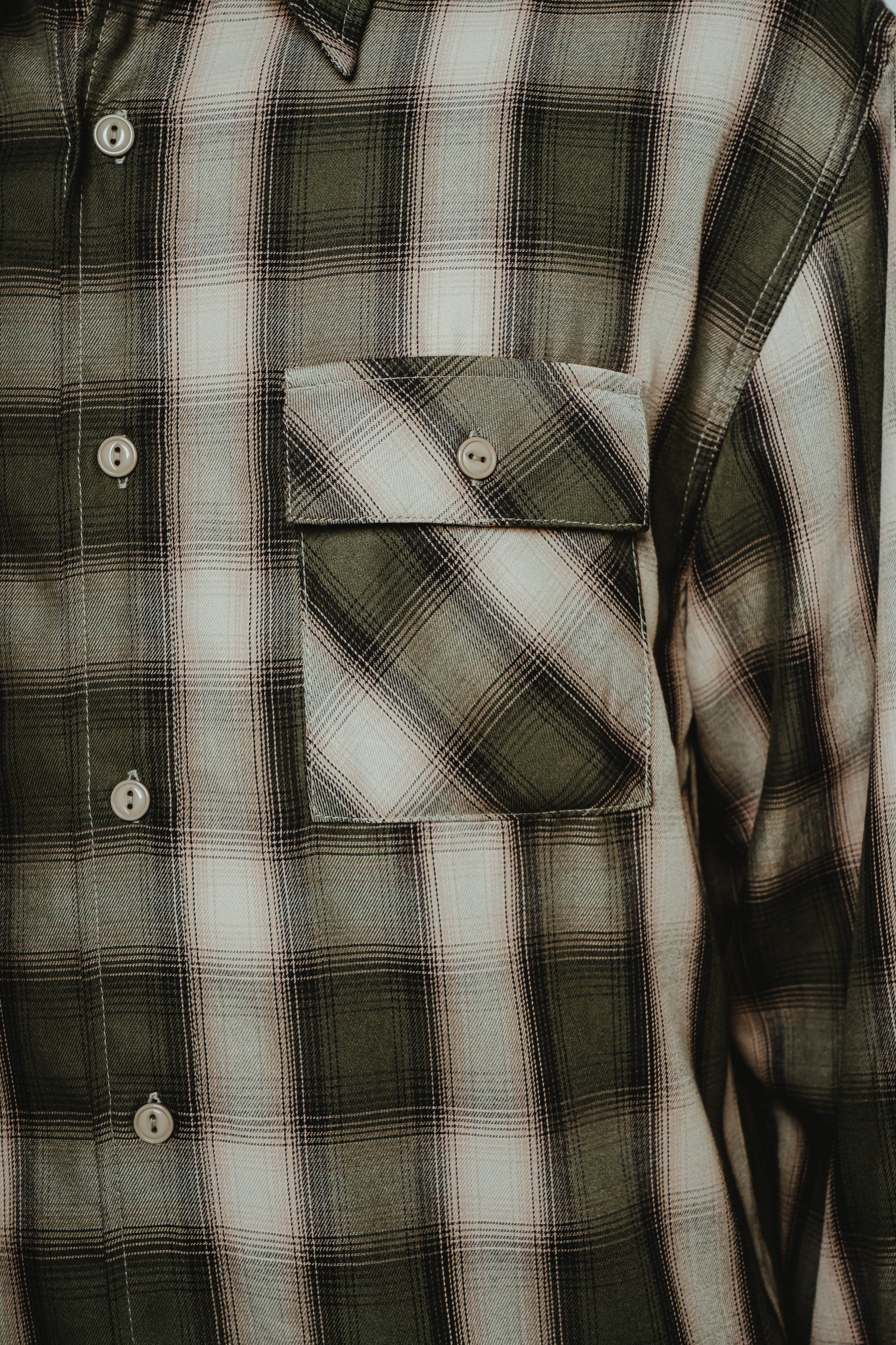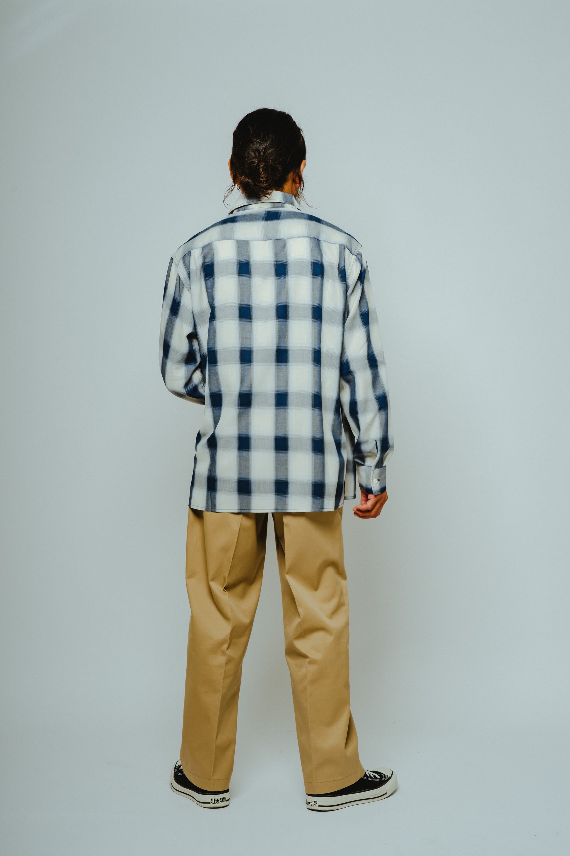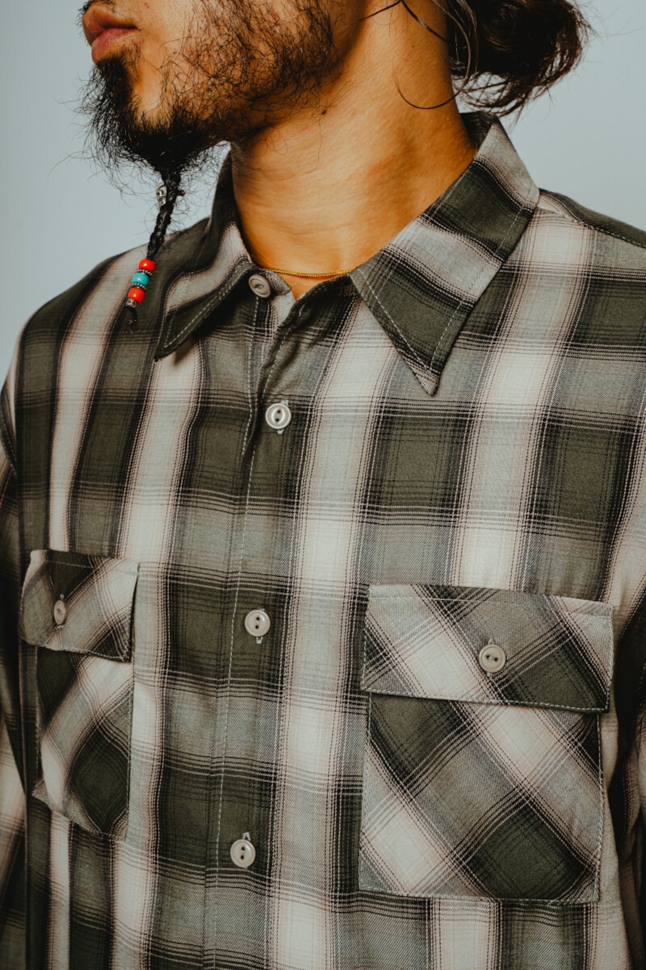 素材にはレーヨン混生地を使用。滑らかな肌触りと上品な落ち感を活かしつつ、オンブレチェックのパターンや色味は現代のスタイルに合わせてアップデートしました。BIGMIKEが得意とするヴィンテージワークシャツのエッセンスをベースに、今の気分で着られるフィットと仕様へと再構築。
