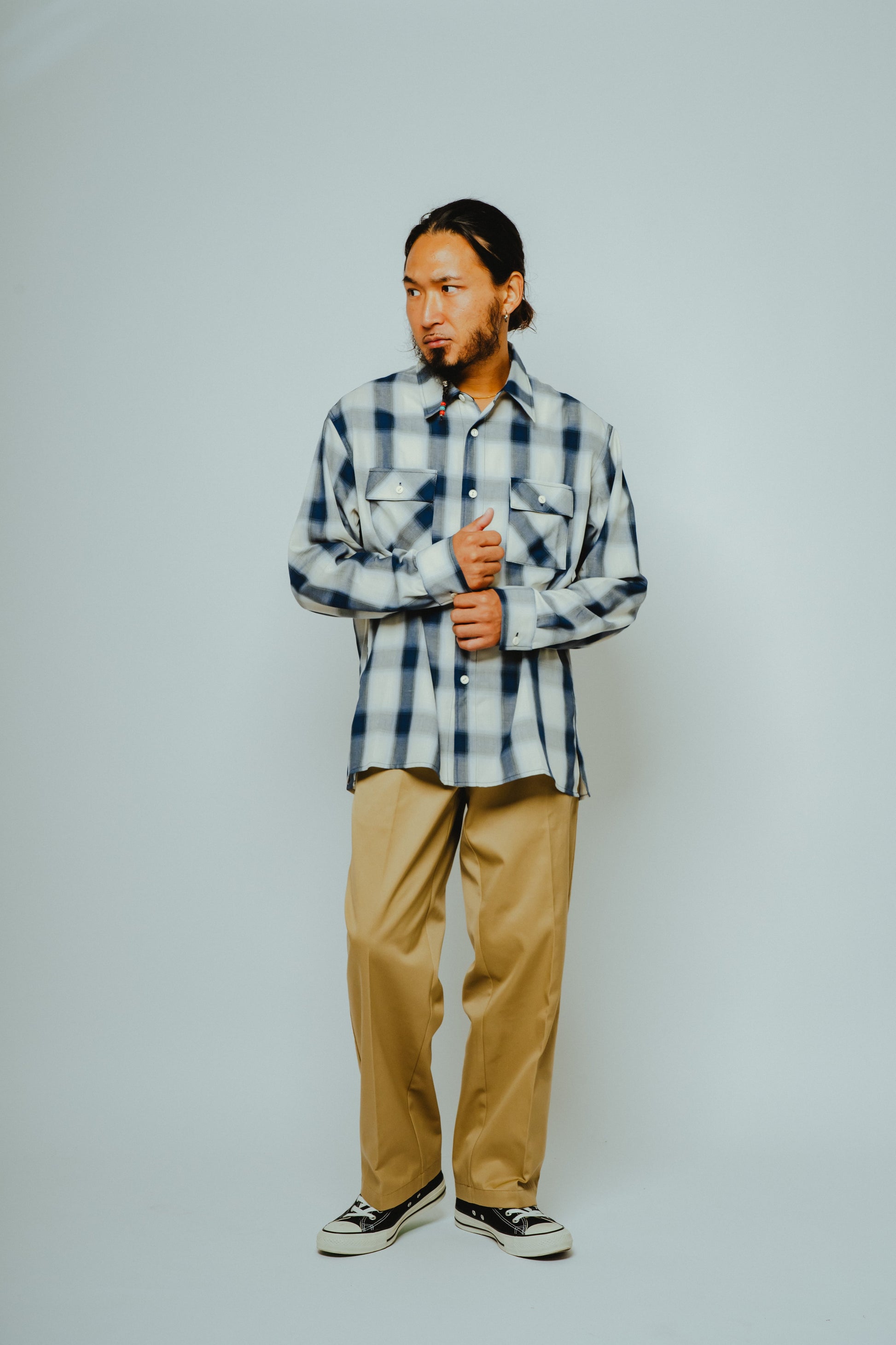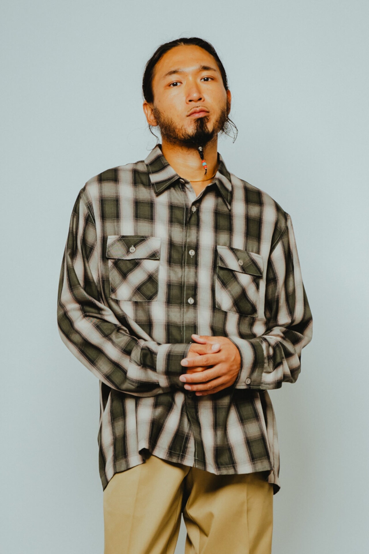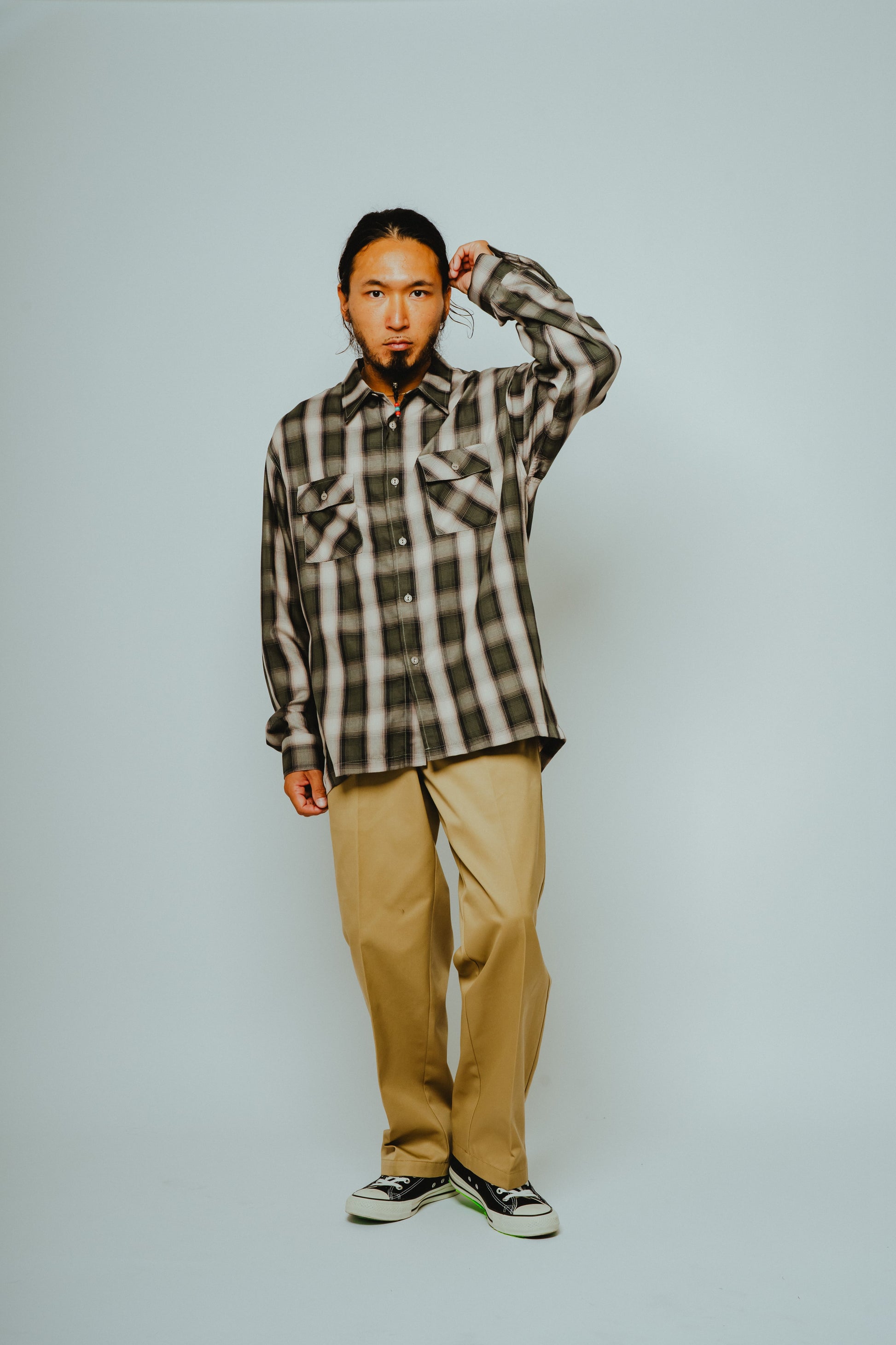素材にはレーヨン混生地を使用。滑らかな肌触りと上品な落ち感を活かしつつ、オンブレチェックのパターンや色味は現代のスタイルに合わせてアップデートしました。BIGMIKEが得意とするヴィンテージワークシャツのエッセンスをベースに、今の気分で着られるフィットと仕様へと再構築。