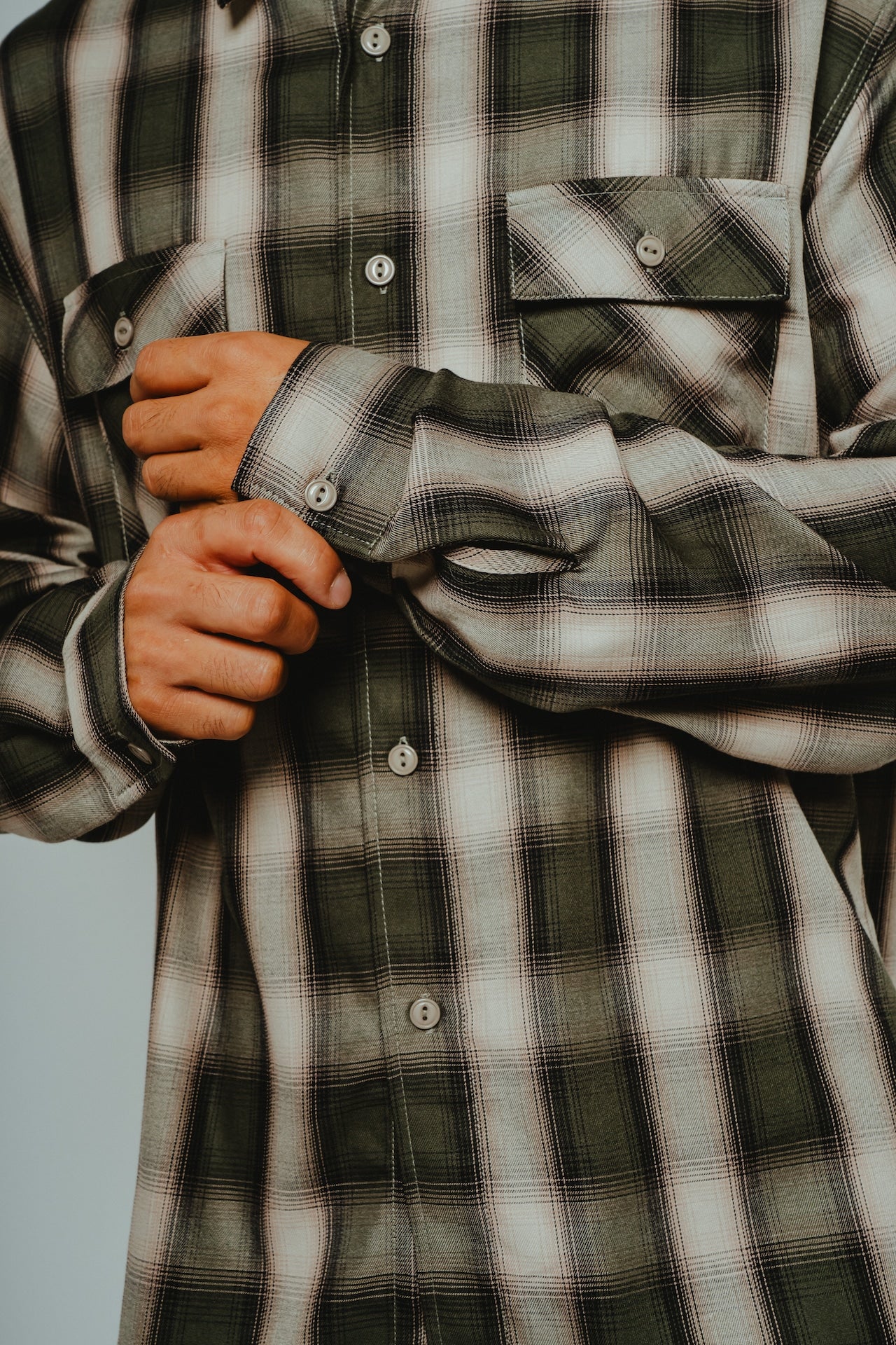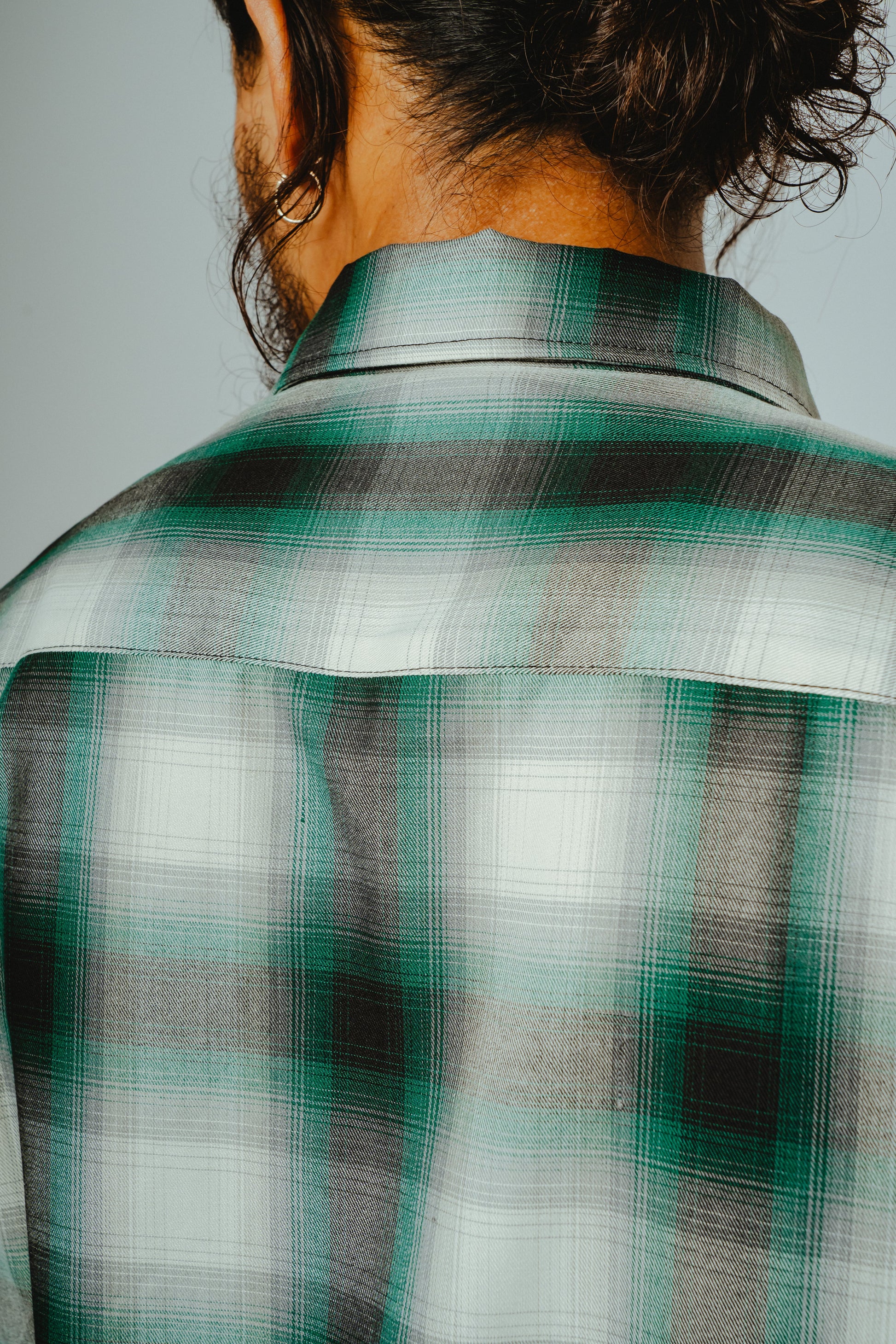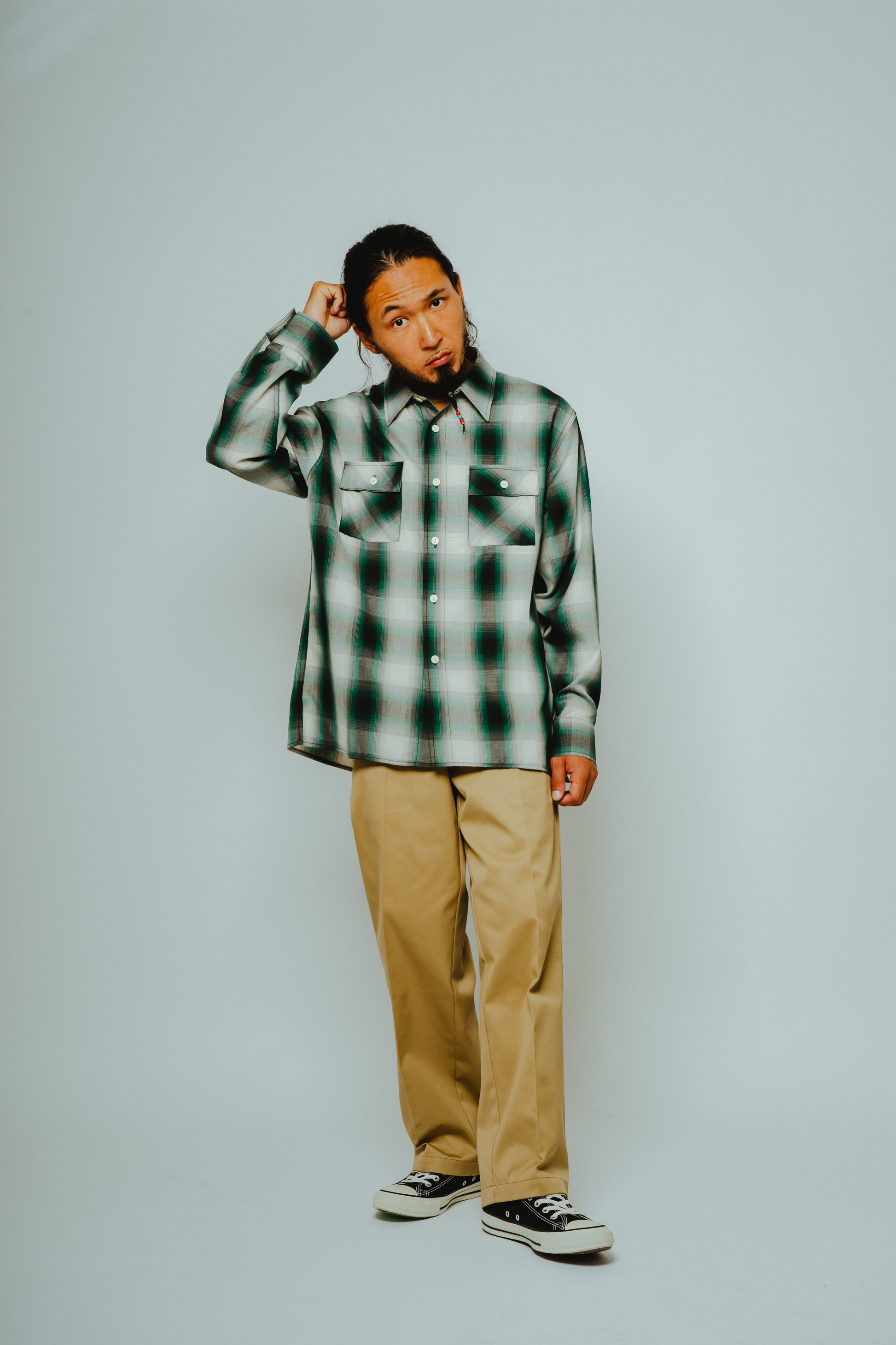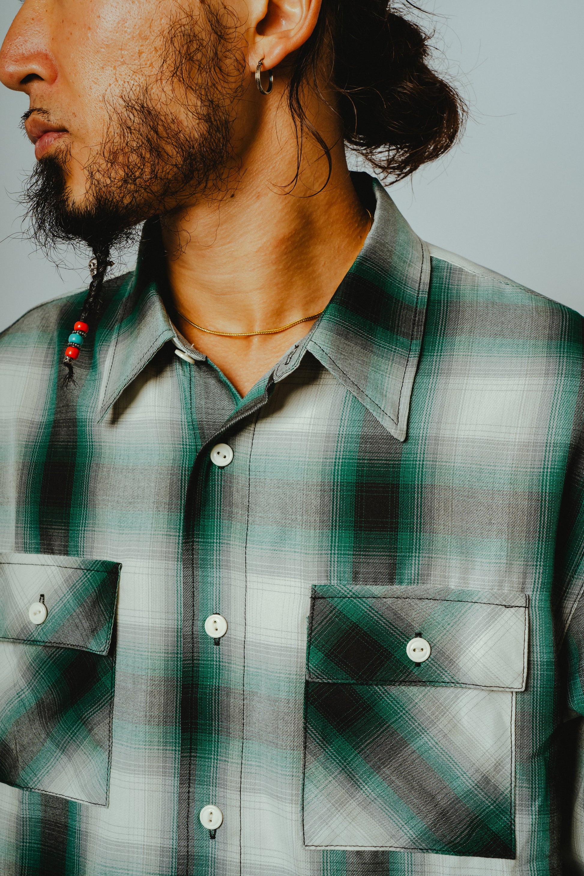 素材にはレーヨン混生地を使用。滑らかな肌触りと上品な落ち感を活かしつつ、オンブレチェックのパターンや色味は現代のスタイルに合わせてアップデートしました。BIGMIKEが得意とするヴィンテージワークシャツのエッセンスをベースに、今の気分で着られるフィットと仕様へと再構築。