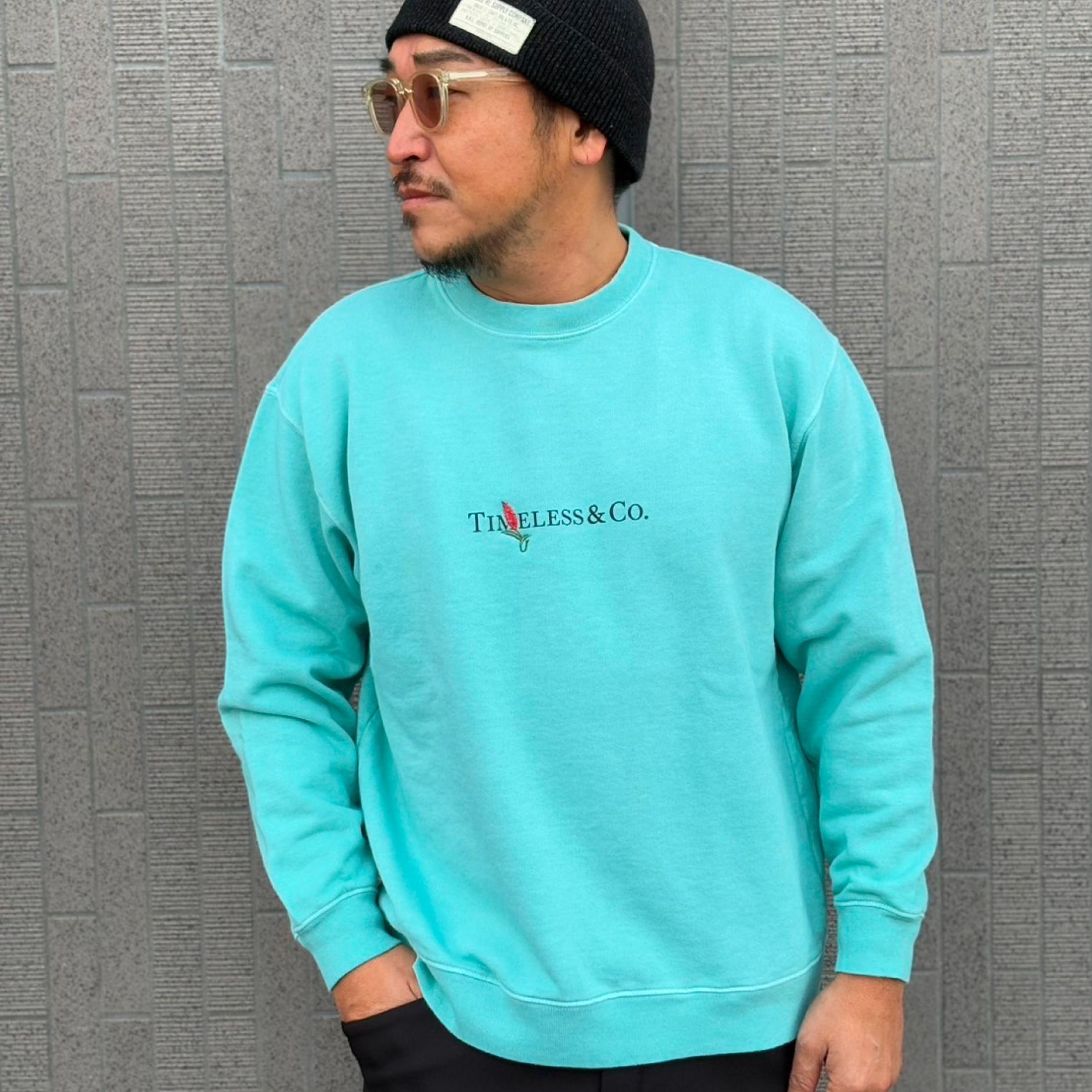 ピグメント染めで経年変化したようなヴィンテージスウェットの面持ちに仕上げている。